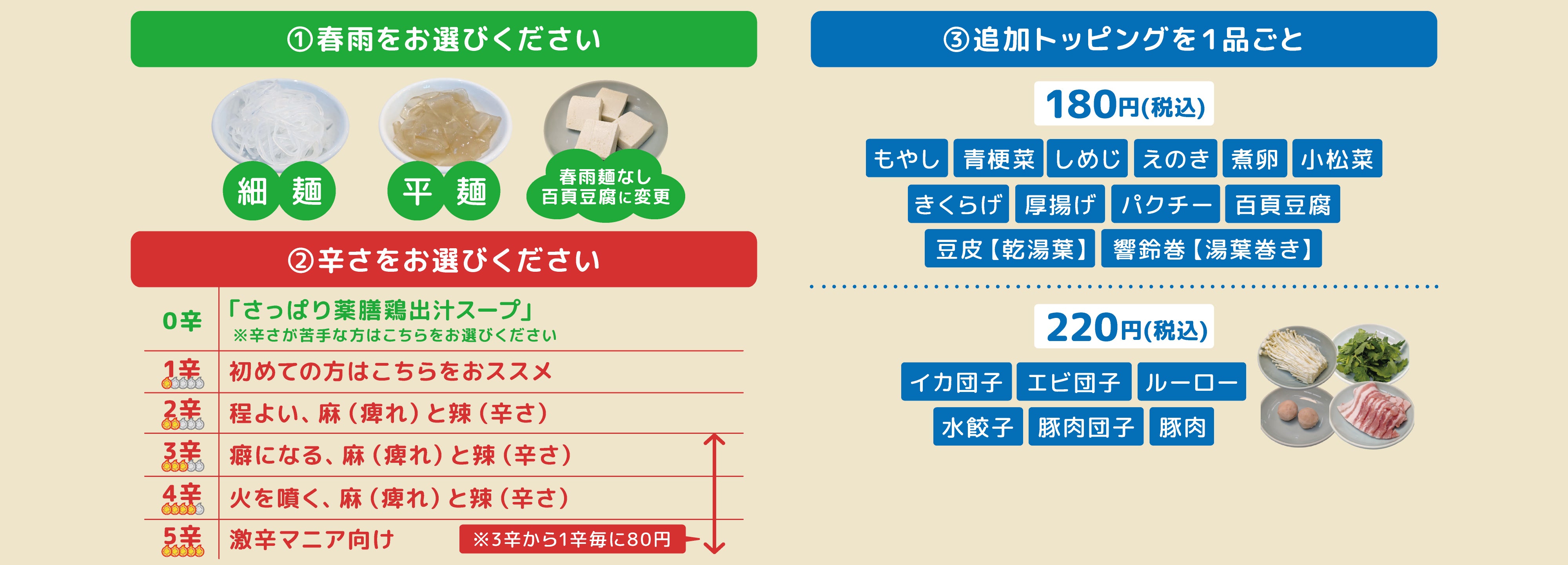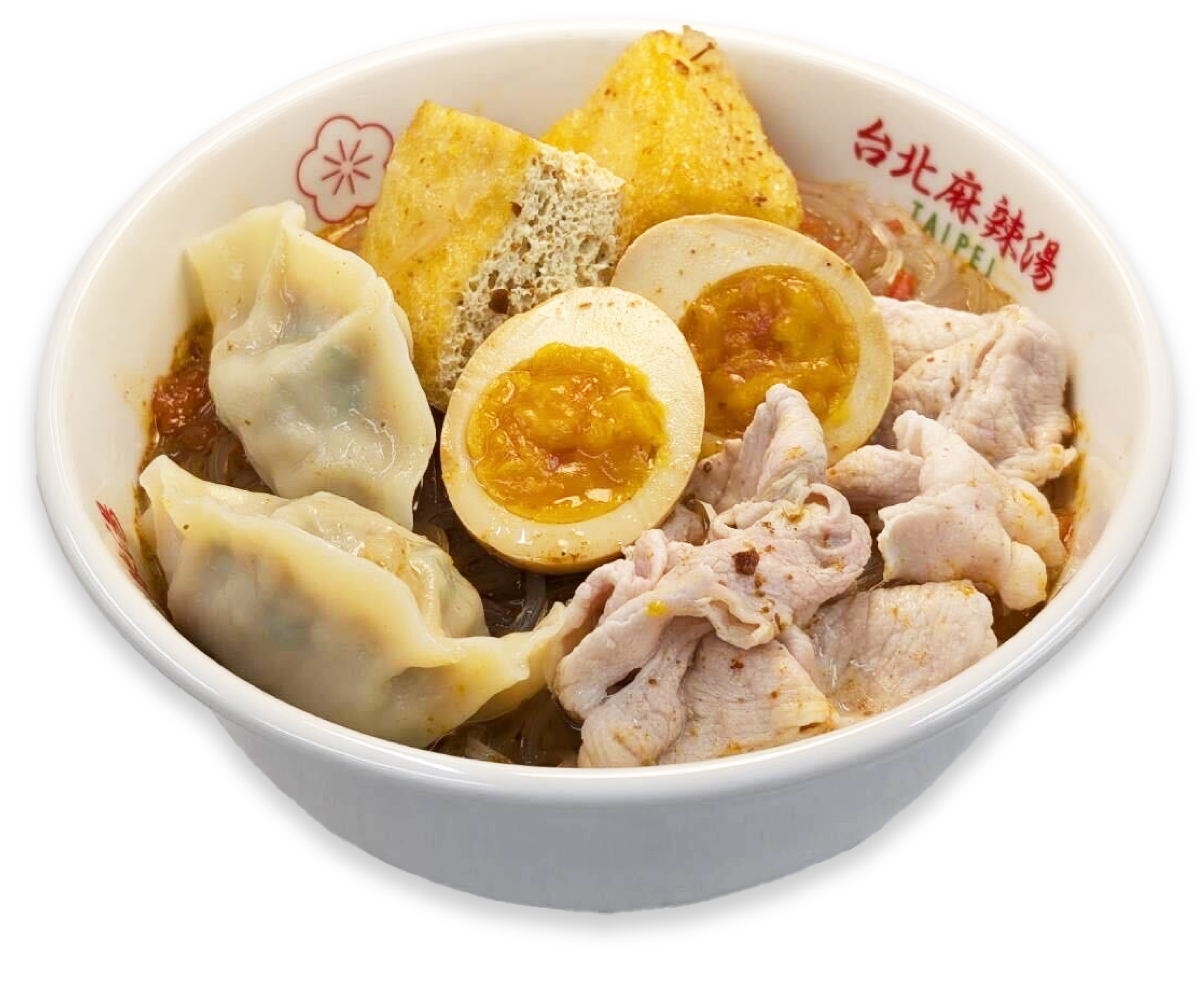 麻辣湯スープ+お好きな麺+豚肉+水餃子+煮卵+厚揚げ