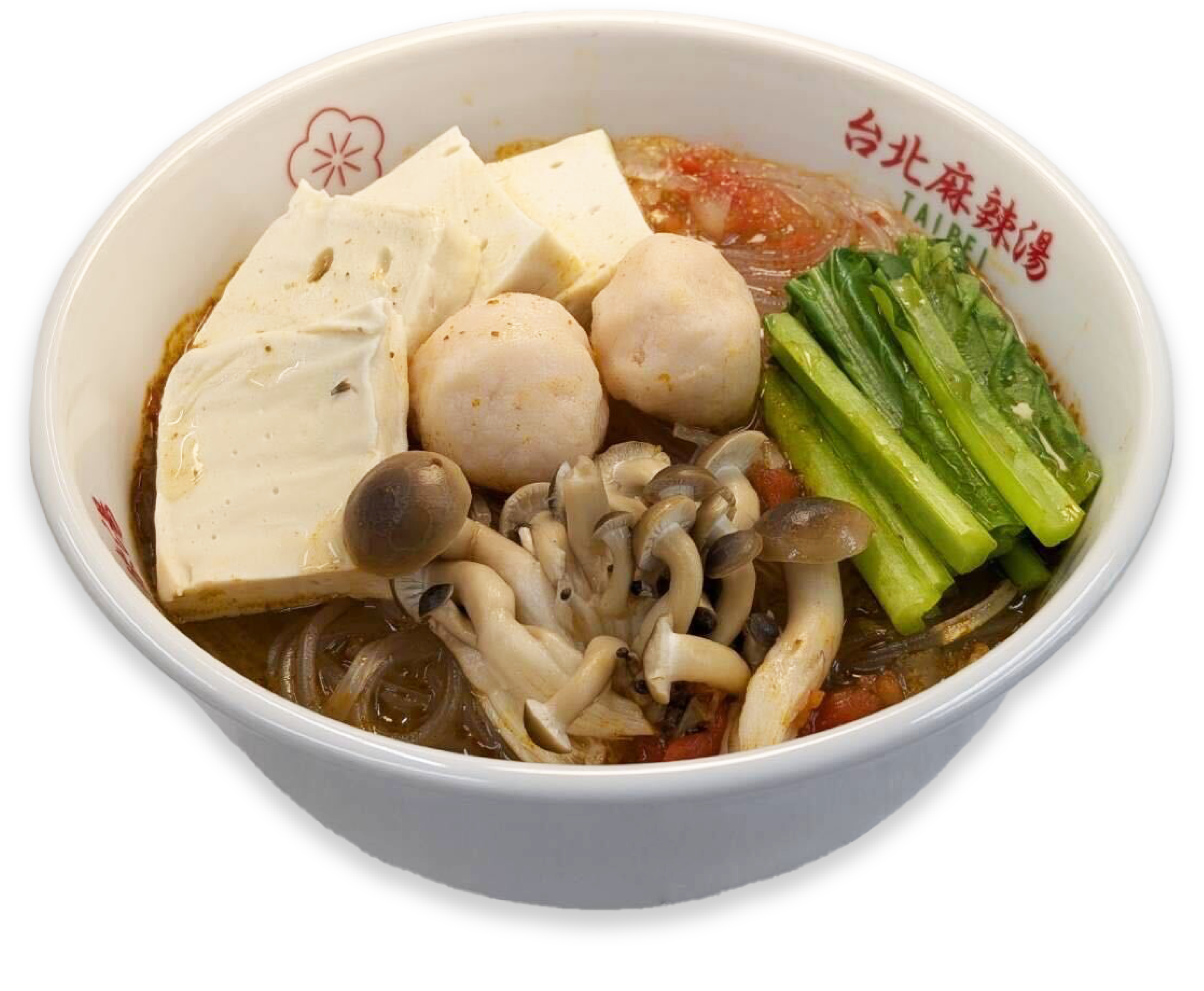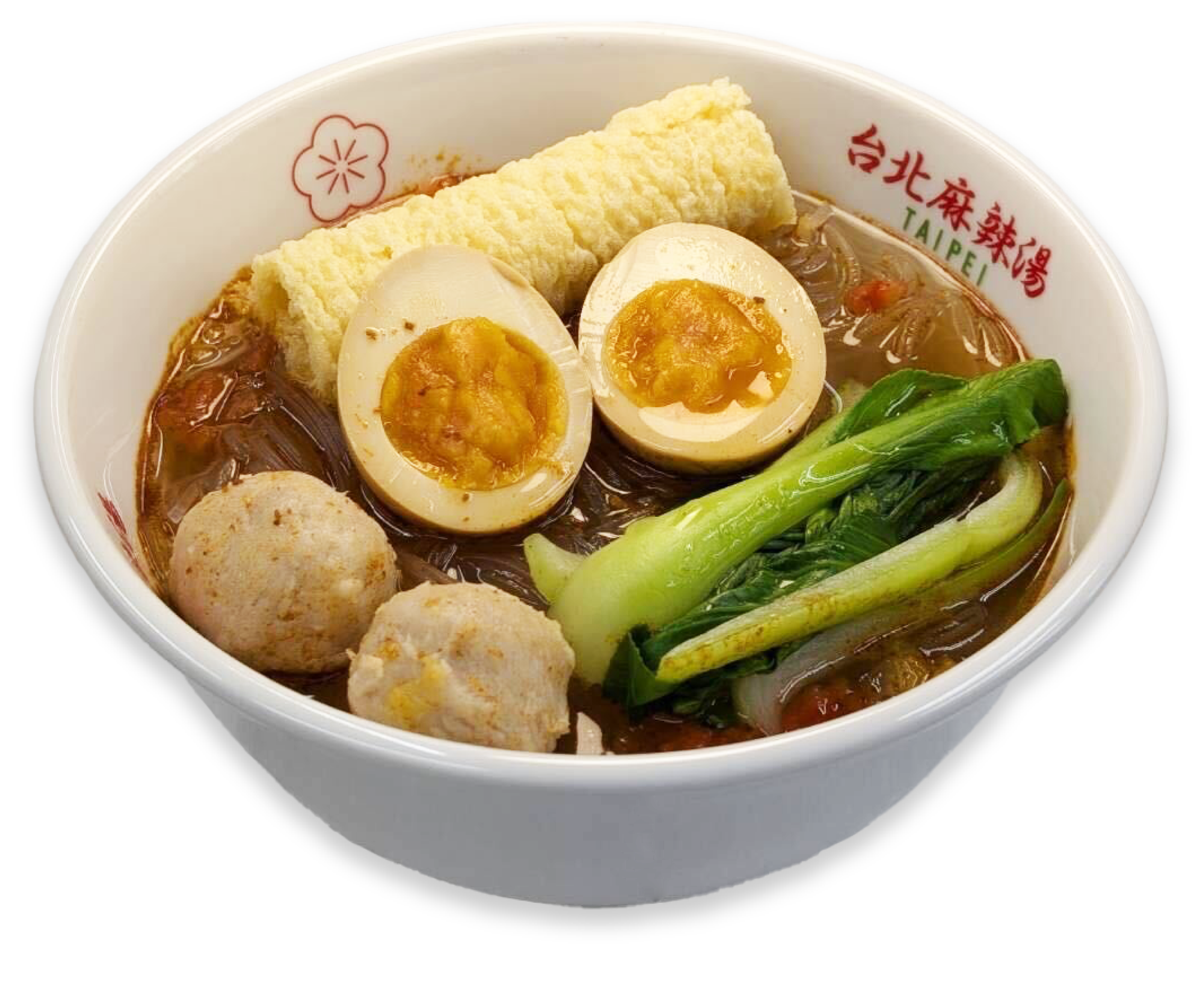 麻辣湯スープ+お好きな麺+響鈴巻(湯葉巻揚げ)+黒猪牌(豚肉団子)+煮卵+青梗菜
